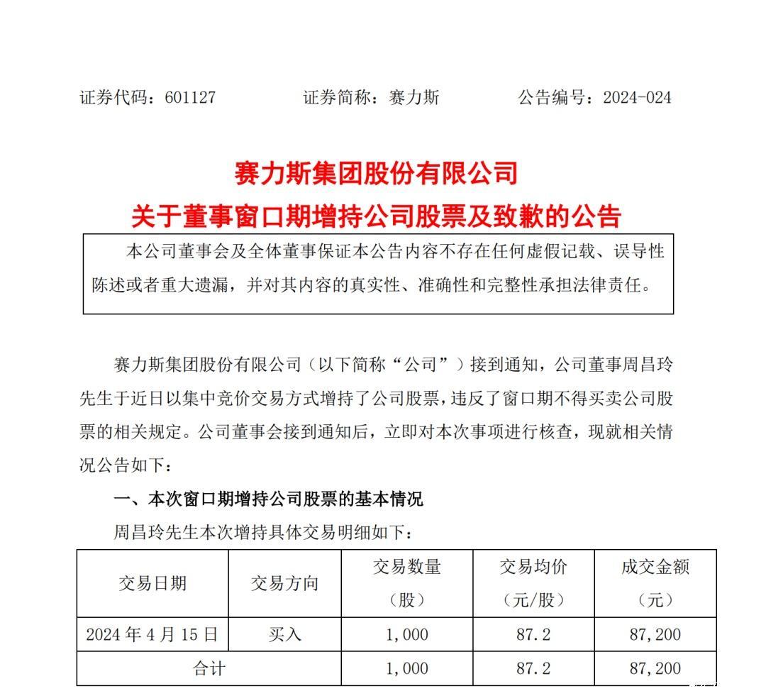 4月17日晚,赛力斯(601127.SH)发布对于董事窗口期增合手公司股票及致歉的公告,指出公司董事周昌玲于近日以都集竞价交游格局增合手了公司股票,违抗了窗口期不得贸易公司股票的关系国法。
