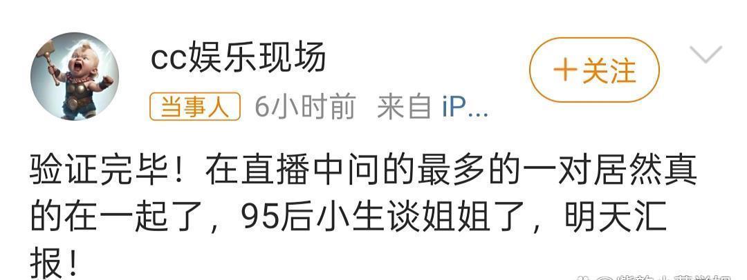 事件的起源是八卦媒体cc文娱现场在微博抛出的重磅音尘:“考证竣事!在直播中问的最多的一双果然真实在沿途了,95后小生谈姐姐了,翌日呈报!”更细心的信息走漏,男方是95后一线男演员,女方是“姐姐型”,可能是圈内女演员也可能是圈外东谈主士,且两东谈主在直播中互动武断,此前虽被屡次说起却未实锤,而具体身份将于10月11日追究公开。这绸缪缱绻又充满勾引的爆料,短暂点火了网友们的有趣心。